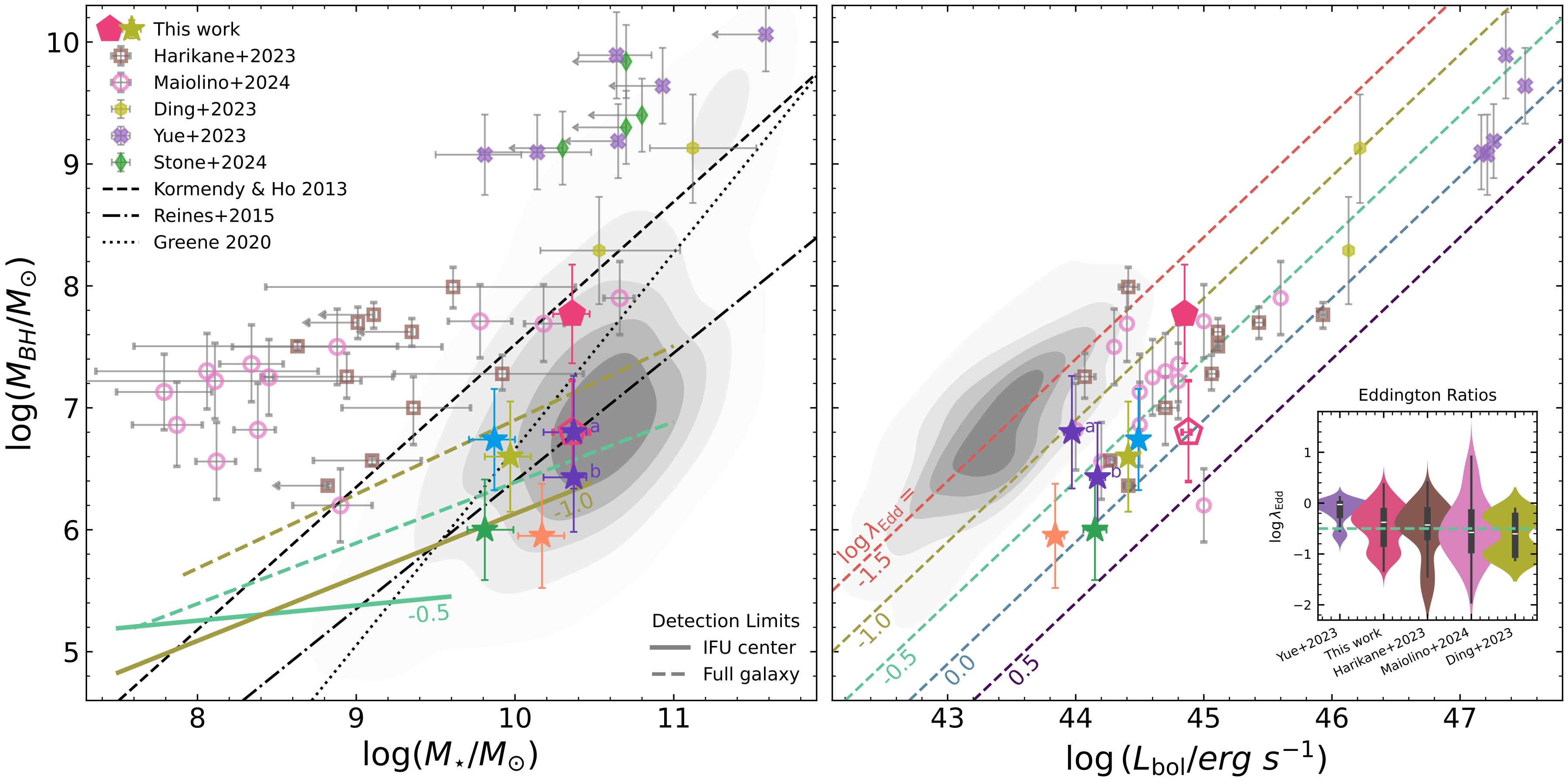 The main result is shown in the figure below. Unlike previous studies, our AGN candidates (stars and pentagon) *lie close to or below the local $M_{BH}-M_{}$ relations** (the dashed and dotted lines). This is the first sample at this redshift to not appear overmassive. It strongly suggests that the “overmassive” trend seen before was a direct result of selection bias.
