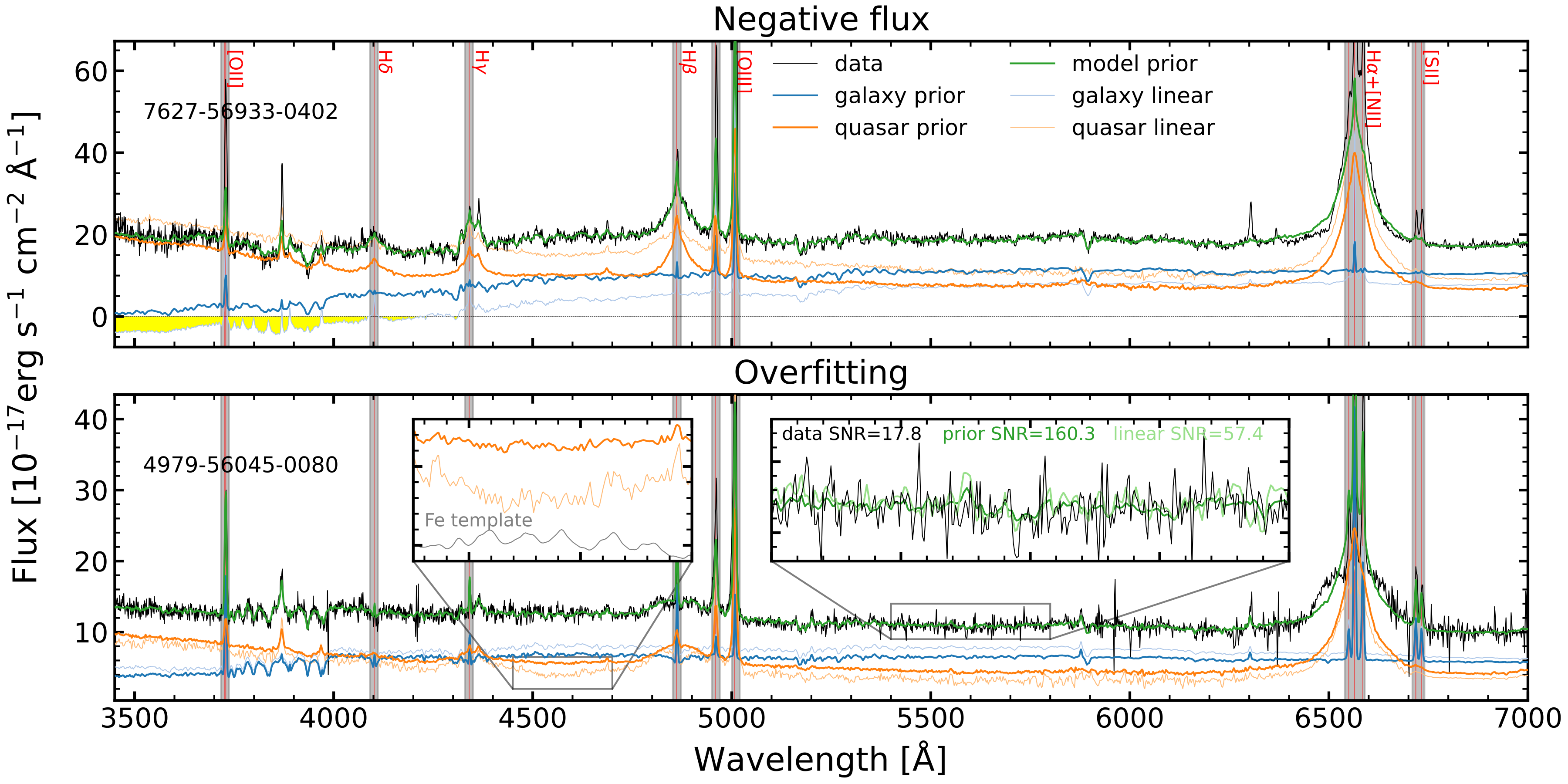 However, the traditional “linear” PCA method has a major flaw: it often fails, especially on the low-SNR spectra common in survey data. The fitting process can become unstable due to degeneracies between the quasar and galaxy templates, leading to two major problems: